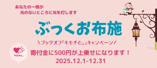 【お申込み受付期間】 2025年12月1日(月)〜12月31日(水) \期間中、買取金額に加えて500円が寄付になります/ ・1回のお申込みにつき、お品物10点以上の送付を対象とさせていただきます。 【対象物品】 本/コミック/CD /DVD その他お送りいただけるものはブックオフ公式オンラインサイトの売れるもの一覧をご確認ください。 【お申込みはこちらから】 |